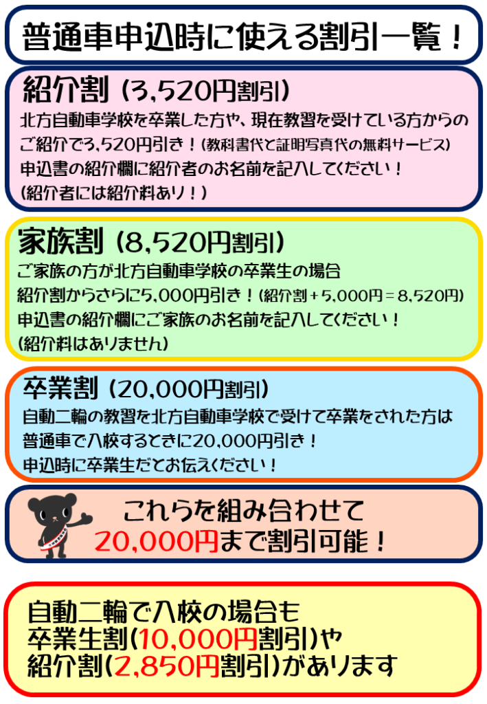 2026.02.11 お知らせ 北方自動車学校・現在のキャンペーン一覧! 現在行っているキャンペーンはありません 教習指導員はこちら https://kghd.co.jp/company/recruit/#:~:text=%E8%81%B7%E7%A8%AE-,%E6%95%99%E7%BF%92%E6%8C%87%E5%B0%8E%E5%93%A1%E3%83%BB%E6%8C%87%E5%B0%8E%E5%93%A1%E8%A6%8B%E7%BF%92%E3%81%84,-%E5%8B%A4%E5%8B%99%E5%9C%B0 事務員はこちら https://kghd.co.jp/company/recruit/#:~:text=%E8%81%B7%E7%A8%AE-,%E4%BA%8B%E5%8B%99%E5%93%A1,-%E6%A5%AD%E5%8B%99%E5%86%85%E5%AE%B9 キャンペーンとは関係なく利用できる割引 前の記事へ 次の記事へ 一覧へ戻る