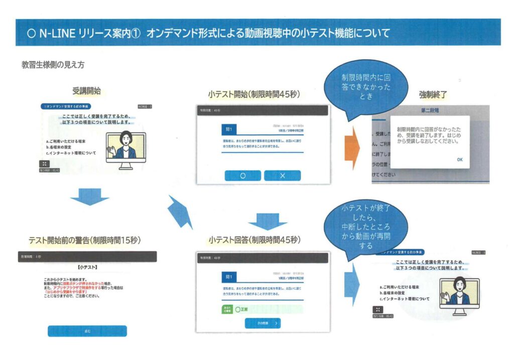 2026.04.12 重要 オンデマンド学科教習について オンデマンド動画内に小テストが追加されます 解答をタップしながら学科教習を受講してください 正解・不正解については問われませんので、必ずタップをお願いします! 下部の画像を拡大したものです 前の記事へ 一覧へ戻る